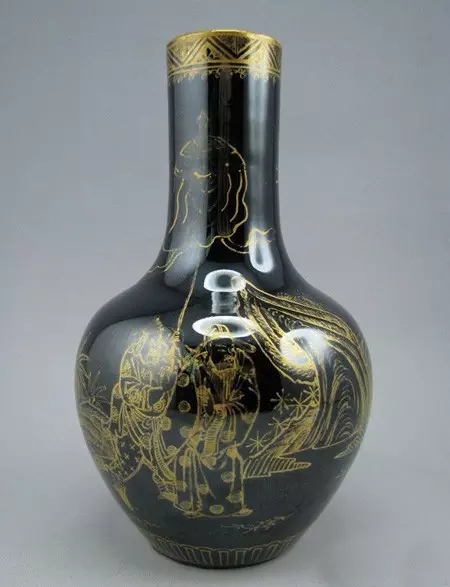 清康熙時(shí)景德鎮(zhèn)瓷工采用景德鎮(zhèn)附近所產(chǎn)含鐵量達(dá)13.4%的烏金土制釉而燒出的一種光潤透亮、色黑如漆的純正黑釉,故名。烏金釉同一般黑釉的區(qū)別除鐵成份外,還含有錳、鈷等元素。烏金釉質(zhì)地細(xì)膩,凈亮如鏡的釉面,為黑釉瓷中難得的佳品,在清代極為盛行,并有烏金加赤金及烏金加金圖案開光畫粉彩等綜合裝飾。